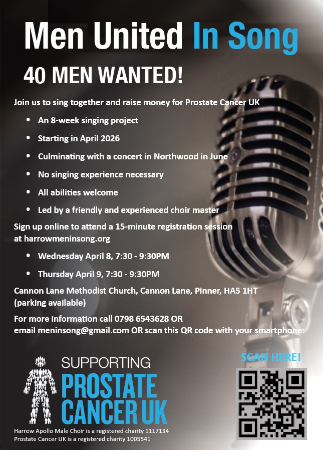 Join other men from Harrow, Hillingdon, Hertfordshire and the surrounding areas who are interested in learning to sing together. No experience needed. Over a period of 8 weeks, you will learn and practice songs, ending with a joint concert with the Harrow Apollo Male Choir in Northwood on Saturday 6th June 2026. Registration will take place on Wednesday 8th April and Thursday 9th April.