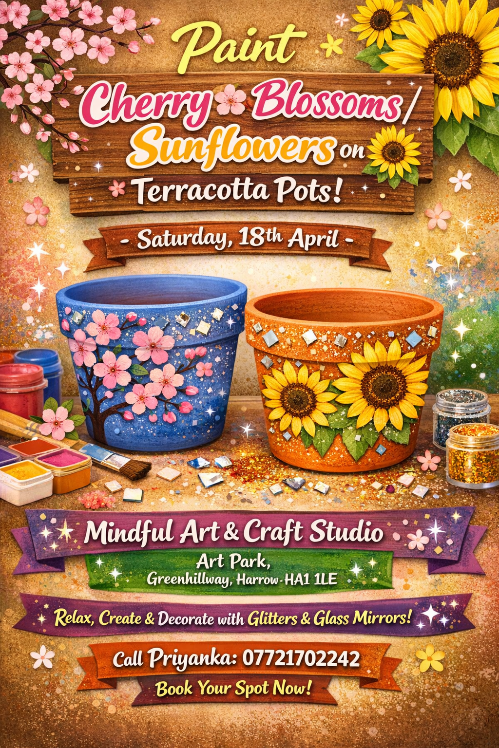 Paint beautiful cherry blossoms or vibrant sunflowers on terracotta pots.  Add your personal touch with shiny glitters and small decorative glass mirrors.  A perfect mindful activity to unwind, get creative, and take home your own handcrafted piece!