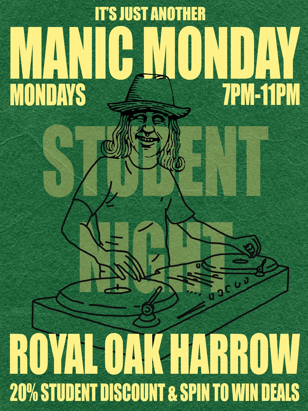 Who’s ready for Manic Monday’s at the Royal Oak? Student night every Monday night with discounts, deals and a DJ too!
