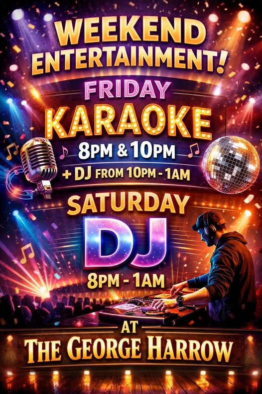 Come and enjoy a great party atmosphere at The George every Friday & Saturday from 8pm.  Karaoke on Friday from 8pm followed by DJ from 10pm.